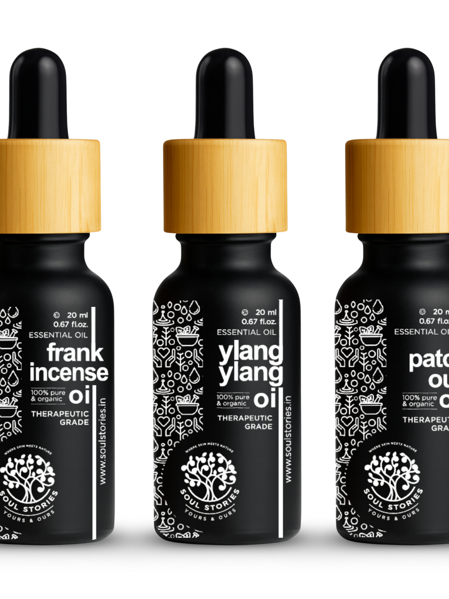The Soul Stories Frankincense Oil + Ylang Ylang Oil + Patchouli Oil Combo is a powerful blend of relaxation, skin rejuvenation, and emotional balance.