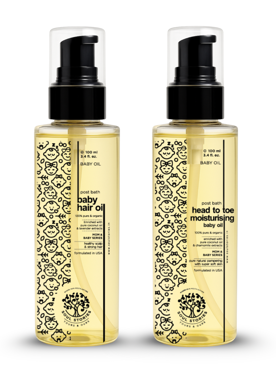 At Soul Stories, we believe in pure, gentle, and effective baby care. The Head to Toe Moisturizing Baby Oil + Baby Hair Oil Combo is made with 100% natural, plant-based ingredients, ensuring deep hydration, nourishment, and protection for your little one.