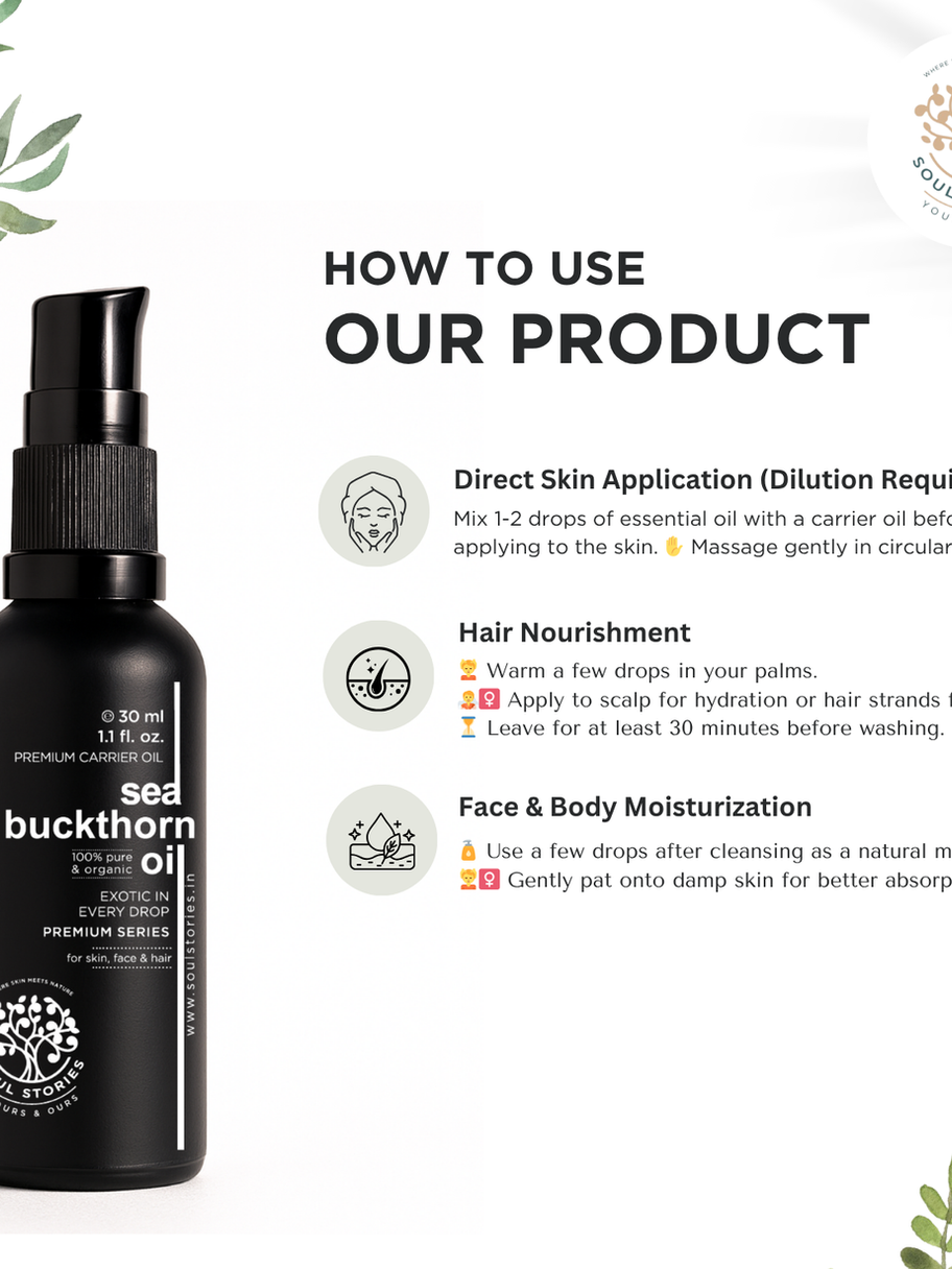Reveal healthier, nourished skin with Soul Stories Sea Buckthorn Oil, a deeply hydrating and restorative oil that enhances skin radiance and hair vitality.